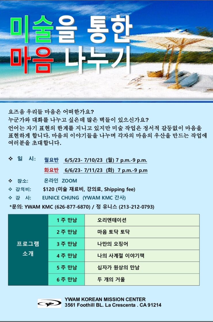 화요일 저녁 7시에 6주간 있습니다. 소수 정원이므로 등록을 빨리 해주셔야 합니다.다양한 미술 재료를 통해 즐겁게 마음의 여행을 함께 떠나요